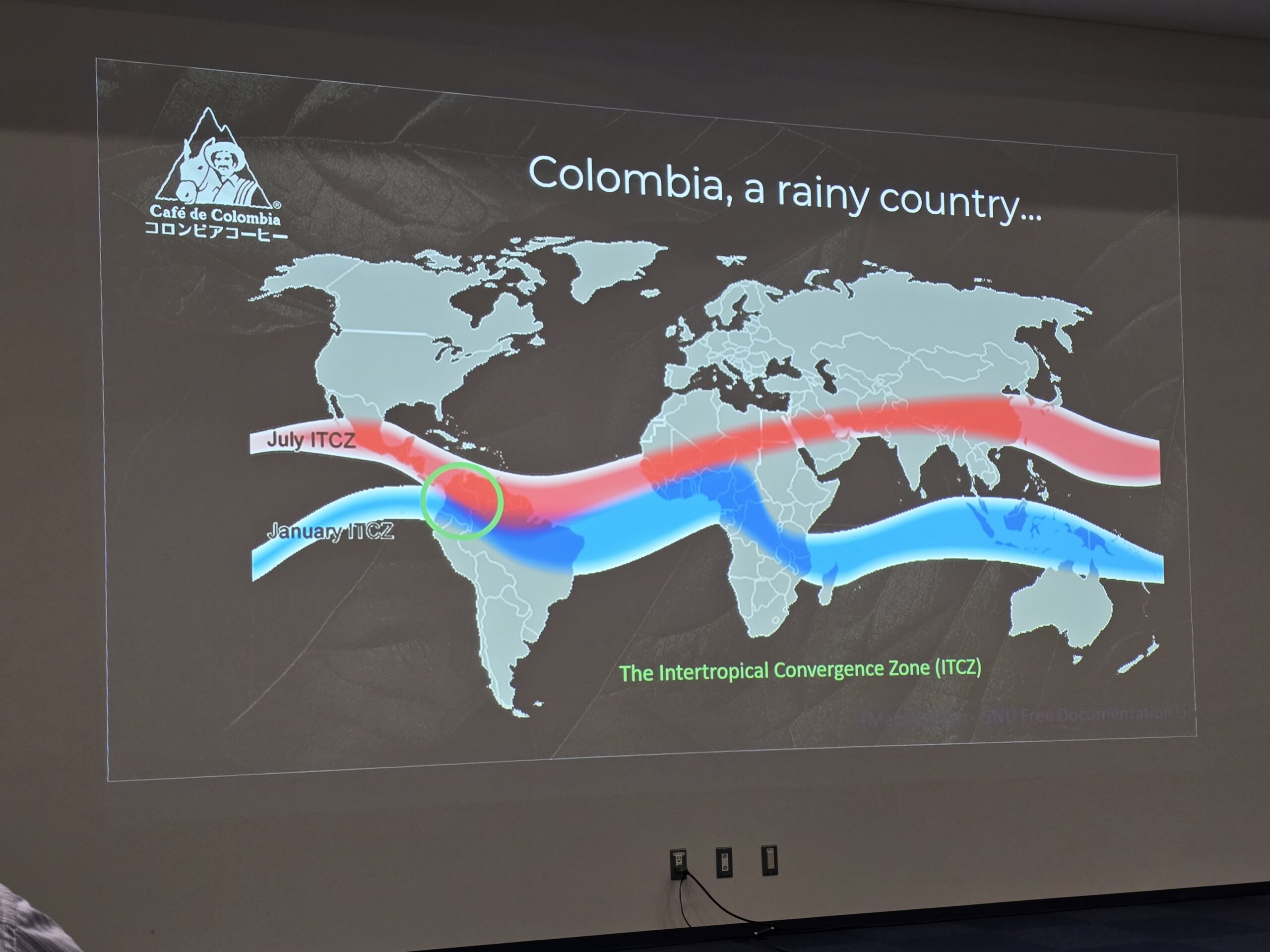 まずはコロンビアの地理的特徴について。コロンビアは熱帯収束帯(Intertropical convergence zone (ITCZ))に位置して、暖かい風の流れが南北へ少しずれる中で、若干の気候の移り変わりが発生します。ただし、基本的には安定した気候の地域です。この熱帯収束帯の帯の上下したタイミングでコーヒーの花が開花し、後に果実をつけることとなります。