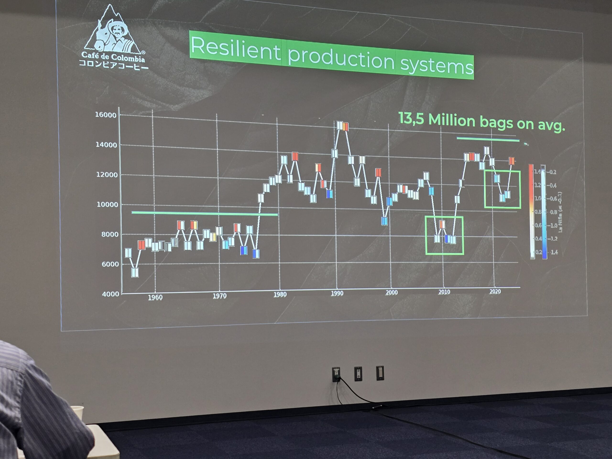 グラフは1956年以降のコロンビアの生産量についてまとめたもの。1960~70年代にかけてはティピカやブルボン等の伝統的な栽培品種が中心でした。当時の生産量は7百万 60kg-bags程度。やがて1980年ごろにカツーラが導入されると生産量が飛躍的に伸びました。2008~2010年ごろに大きな減少が記録されているのはラニーニャのせい。この時の農園は古木が多かったり、肥料が十分ではなかった結果、大きなダメージを受けました。直近もラニーニャが発生しましたが、その後、政府の支援のもとコーヒーノキの入れ替えや十分な肥料を与えた結果、今回は8%の生産量減少で済んでいます。結果として直近の年間平均収穫量は13.5百万 60kg-bagsとなっています。